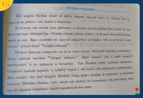 娜塔莎服了藥,但是她沒有感到好轉(zhuǎn)。尼古拉給醫(yī)院打了電話。很快就來了一輛救護車。醫(yī)生說,我朋友得的是闌尾炎,于是接收她住院治療。在那里馬上給娜塔莎做了手術(shù)。手術(shù)很順利,星期六早上她已經(jīng)不發(fā)燒了。醫(yī)生說,我的朋友娜塔莎很快就會康復(fù),住院的時間不會太長。娜塔莎說,她出院以后會給我們講講醫(yī)生是怎樣給她做手術(shù)的,醫(yī)生是多么的出色。